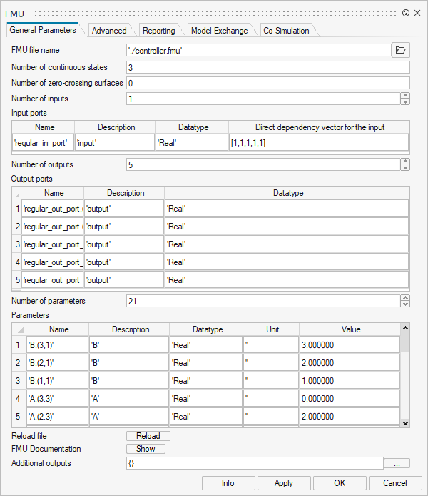 The FMU block has one input and 5 outputs. Note that all inputs and