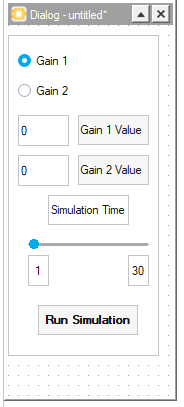 % Auto-generated code [UI Designer] % Altair Twin Activate 2023 % Last update: Fri Jan 19 09:11:07 2024 %------------------------------------------------------------ % % Callback functions: %------------------------------------------------------------ function gain1_button_callback(handle, data, varargin) % Add implementation: [callback] end function gain2_button_callback(handle, data, varargin) % Add implementation: [callback] end function gain1_value_callback(handle, data, varargin) % Add implementation: [callback] end function gain2_value_callback(handle, data, varargin) % Add implementation: [callback] end function simtime_slider_callback(handle, data, varargin) % Add implementation: [callback] end function runsim_button_callback(handle, data, varargin) % Add implementation: [callback] end %------------------------------------------------------------ % % GUI objects: %------------------------------------------------------------ Dialog = figure('units', 'pixels', 'position', [0 0 167 346] ... , 'name','Dialog', 'windowicon','', 'windowstyle','undocked' ... , 'tag','Dialog', 'handlevisibility','on', 'numbertitle','off', 'visible','on'); uiPanel = uipanel('parent', Dialog, 'units','normalized', 'position',[0.00 0.03 0.96 0.96] ... , 'enable','on', 'fontname','MS Shell Dlg', 'fontangle','regular', 'fontweight','normal', 'fontsize',8.25 , 'fontunits','pixels' ... , 'backgroundcolor', [246 246 246] ... , 'bordertype','none', 'borderwidth', 1 , 'title','' ... , 'aspectratio','off', 'backgroundimage','', 'tag','uiPanel' ... , 'userdata',[], 'value',0, 'tooltipstring','', 'visible','on'); gain1_button = uicontrol('parent', uiPanel, 'style','radiobutton' ... , 'callback','gain1_button_callback', 'units','normalized', 'position',[0.07 0.03 0.66 0.09] ... , 'enable','on', 'fontname','MS Shell Dlg', 'fontangle','regular', 'fontweight','normal', 'fontsize',8.25 , 'fontunits','pixels' ... , 'string','Gain 1', 'value', 1 , 'foregroundcolor', [20 20 20] ... , 'interruptible','off', 'tag','goption', 'userdata',[], 'tooltipstring','', 'visible','on'); gain2_button = uicontrol('parent', uiPanel, 'style','radiobutton' ... , 'callback','gain2_button_callback', 'units','normalized', 'position',[0.07 0.12 0.66 0.09] ... , 'enable','on', 'fontname','MS Shell Dlg', 'fontangle','regular', 'fontweight','normal', 'fontsize',8.25 , 'fontunits','pixels' ... , 'string','Gain 2', 'value', 0 , 'foregroundcolor', [20 20 20] ... , 'interruptible','off', 'tag','gain2_button', 'userdata',[], 'tooltipstring','', 'visible','on'); gain1_value = uicontrol('parent', uiPanel, 'style','edit' ... , 'callback','gain1_value_callback', 'units','normalized', 'position',[0.07 0.25 0.34 0.10] ... , 'enable','on', 'fontname','MS Shell Dlg', 'fontangle','regular', 'fontweight','normal', 'fontsize',8.25 , 'fontunits','pixels' ... , 'string','0' ... , 'horizontalalignment','left' ... , 'verticalalignment','middle', 'foregroundcolor', [20 20 20], 'backgroundcolor', [255 255 255] ... , 'interruptible','off', 'tag','g1v', 'userdata',[] ... , 'value',0, 'tooltipstring','', 'visible','on'); gain1_text = uicontrol('parent', uiPanel, 'style','text' ... , 'units','normalized', 'position',[0.46 0.25 0.47 0.09] ... , 'enable','on', 'fontname','MS Shell Dlg', 'fontangle','regular', 'fontweight','normal', 'fontsize',8.25 , 'fontunits','pixels' ... , 'string','Gain 1 Value' ... , 'horizontalalignment','left' ... , 'verticalalignment','middle', 'foregroundcolor', [20 20 20], 'backgroundcolor', [255 255 255] ... , 'tag','gain1_text', 'userdata',[], 'value',0, 'tooltipstring','', 'visible','on'); gain2_text = uicontrol('parent', uiPanel, 'style','text' ... , 'units','normalized', 'position',[0.46 0.37 0.47 0.09] ... , 'enable','on', 'fontname','MS Shell Dlg', 'fontangle','regular', 'fontweight','normal', 'fontsize',8.25 , 'fontunits','pixels' ... , 'string','Gain 2 Value' ... , 'horizontalalignment','left' ... , 'verticalalignment','middle', 'foregroundcolor', [20 20 20], 'backgroundcolor', [255 255 255] ... , 'tag','gain2_text', 'userdata',[], 'value',0, 'tooltipstring','', 'visible','on'); gain2_value = uicontrol('parent', uiPanel, 'style','edit' ... , 'callback','gain2_value_callback', 'units','normalized', 'position',[0.07 0.37 0.34 0.10] ... , 'enable','on', 'fontname','MS Shell Dlg', 'fontangle','regular', 'fontweight','normal', 'fontsize',8.25 , 'fontunits','pixels' ... , 'string','0' ... , 'horizontalalignment','left' ... , 'verticalalignment','middle', 'foregroundcolor', [20 20 20], 'backgroundcolor', [255 255 255] ... , 'interruptible','off', 'tag','g2v', 'userdata',[] ... , 'value',0, 'tooltipstring','', 'visible','on'); simtime_slider = uicontrol('parent', uiPanel, 'style','slider' ... , 'callback','simtime_slider_callback', 'units','normalized', 'position',[0.13 0.62 0.80 0.07] ... , 'enable','on', 'max', 30 , 'min', 1 , 'orient','horizontal', 'sliderstep', [1 10] ... , 'tracking', 'on', 'tickinterval', 1, 'tickmarks', 'nomarks' ... , 'callbackdelay',0.000000, 'interruptible','off', 'tag','simtimev' ... , 'userdata',[], 'tooltipstring','', 'visible','on'); simtime = uicontrol('parent', uiPanel, 'style','text' ... , 'units','normalized', 'position',[0.26 0.50 0.54 0.09] ... , 'enable','on', 'fontname','MS Shell Dlg', 'fontangle','regular', 'fontweight','normal', 'fontsize',8.25 , 'fontunits','pixels' ... , 'string','Simulation Time' ... , 'horizontalalignment','left' ... , 'verticalalignment','middle', 'foregroundcolor', [20 20 20], 'backgroundcolor', [255 255 255] ... , 'tag','simtime', 'userdata',[], 'value',0, 'tooltipstring','', 'visible','on'); runsim_button = uicontrol('parent', uiPanel, 'style','pushbutton' ... , 'callback','runsim_button_callback', 'units','normalized', 'position',[0.20 0.84 0.66 0.09] ... , 'enable','on', 'fontname','MS Shell Dlg', 'fontangle','regular', 'fontweight','bold', 'fontsize',8.00 , 'fontunits','pixels' ... , 'string','Run Simulation', 'horizontalalignment','center' ... , 'backgroundcolor', [255 255 255], '