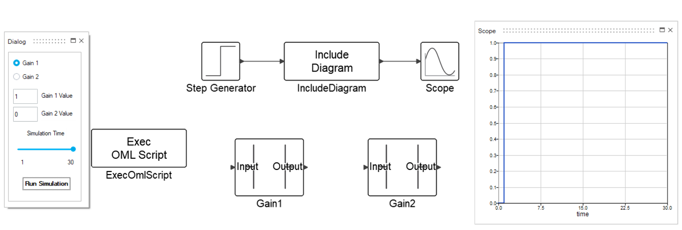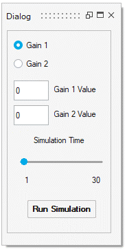 When a Twin Activate model is run from this block, some parameters and functions must be used. This GUI has a PushButton that will start the simulation, so the commands below must be used inside the callback function of this Widget:clc, clear, close allmodel = bdeGetCurrentModel; %Get handle of current model aux_g1v = findobj('tag', 'g1v'); %Auxiliar variable to the Gain1 value ctx.g1 = str2num(get(aux_g1v, 'string')); %Getting Gain1 Value aux_g2v = findobj('tag', 'g2v'); %Auxiliar variable to the Gain2 value ctx.g2 = str2num(get(aux_g2v, 'string')); %Getting Gain2 Value aux_rbut = findobj('tag', 'goption'); %Auxiliar variable to the RadioButton option rbut = get(aux_rbut, 'value'); %Getting RadioButton Value - 1: 1st Gain, 0: 2nd Gain if rbut == 1 ctx.Gain = 1; %Select the first SuperBlock - Gain1 else ctx.Gain = 2; %Select the second SuperBlock - Gain2 end aux_sliv = findobj('tag', 'simtimev'); %Auxiliar variable to the Slider value ctx.simtime = get(aux_sliv, 'value'); %Getting Final Simulation Time env = getnewenv; %Create a new environment variable to read/write the signals vssRunSimulation(model,ctx,env); %Run Twin Activate simulationBelow is the final OML code to be used inside the ExecOmlScript: