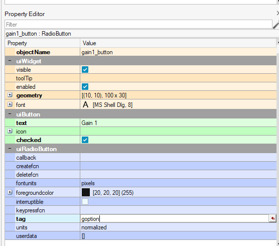 You can also right-click an object and define a number of properties through the context menu. The Gain selection, its values, and simulation time parameters are manipulated on the main code on Twin Activate. Therefore, it is good practice to set ‘tag’ values on each of them. Example on the Gain RadioButton: