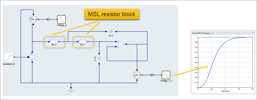 One of the two original resistor blocks is replaced with the Modelica Component. Your model should look something like this: