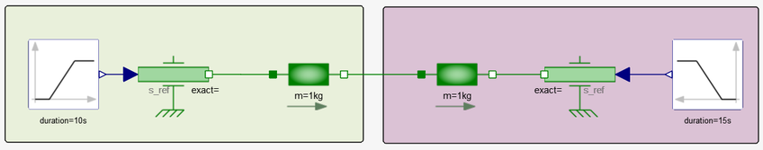 The model below shows a very common issue in models built to work as FMUs: the two masses, rigidly connected together, have their positions set by two different sources.