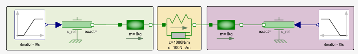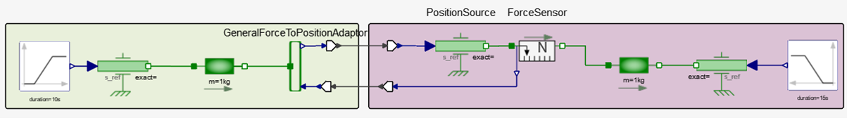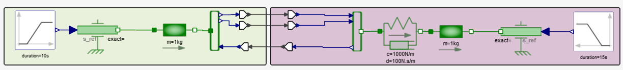 When it comes to Modelica components, you must also consider an additional conversion: although FMU blocks requires pure numerical signals at their interface, Modelica components are usually connected through “physical” connection. For example, a connection between a spring and a mass appears as a single link, but it internally connects two numerical sub-signals, namely the position and the force.