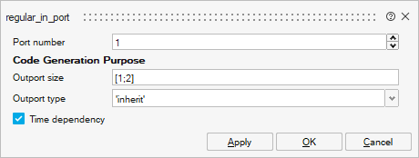 - If the super block contains input ports, inside the super block, click on the Input blocks and select the Time dependency check box and fill the input dimensions with the correct values, as shown in Figure 21. Otherwise, an FMU with only discrete-time variables will be generated and the size of input ports will be one.