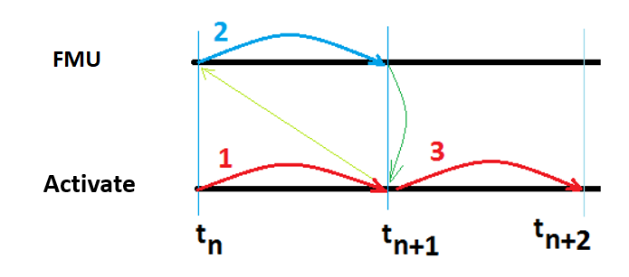 As described in Co-Simulation Algorithms, Twin Activate and the FMU for co-simulation alternate between calling their respective solvers to solve and advance time between communication points and coupling shared data (inputs/outputs) at these communication points. At any particular time (ti), Twin Activate will take a time step from ti to ti+1 first and then call to the FMU to advance the time with fmixDoStep. Twin Activate calls fmixDoStep for either the flag VssFlag_OutputUpdate or VssFlag_EventScheduling depending on the model and FMU parameter settings.