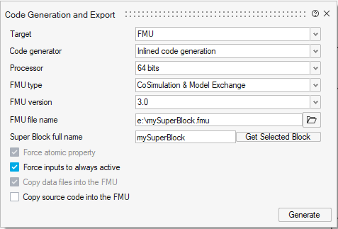 The generated FMU can be imported as an FMU with the FMU block and be tested to verify whether it gives the same result.
