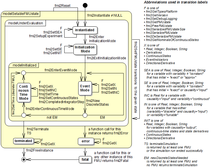 In this kind of the interface, ordinary differential equations with events and zero-crossings are handled. Algebraic equation systems might be contained inside the FMU. Also, the FMU might consist of discrete-time equations activated by events, for example a sampled-data controller. Since the overhead is small, this kind of FMU can be used for very large models as well as for small embedded systems. An FMU for Model Exchange operates in three main modes, Initialization mode, Continuous-time mode, and event-mode. The state machine of the FMU/ME is illustrated below: