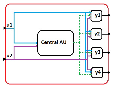 In the resulting network of basic blocks, each output unit keeps the direct-feedthrough property of the corresponding FMU output port. The central unit, on the other hand, does not have the direct feedthrough. In order to communicate within this network, the central block outputs the internal structure, which contains the FMU context, and shares it with other blocks of the network.