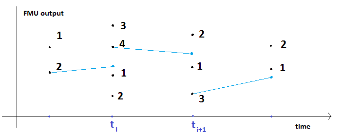 At ti+1, the output of FMU is until fmixDoStep is called at the mesh-point and the output of FMU is retrieved. The output is retried and displayed at the next communication point.
