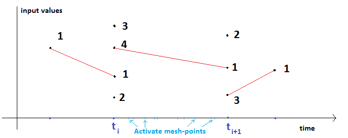 If the Preferred fixed communication stepsize in the co-simulation tab of the FMU block is non-zero, then the communication points are periodic. i.e., in Figure 25, ti and ti+1 are communication points. Between communication points, there may be several Twin Activate mesh-points, see Figure 25. The FMU is activated by a periodic events where at each event time, fmixDoStep is called. In this case, before calling fmixDoStep at the event time of ti+1, the input of the FMU at the previous communication point (i.e., uF(ti)) is given to the FMU.