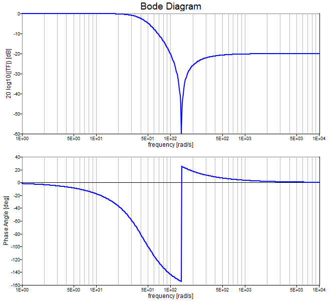 Create the Bode diagram of a 2nd order Chebyshev II low pass analog filter with a 100 radians/sec cutoff frequency and -20 db attenuation.