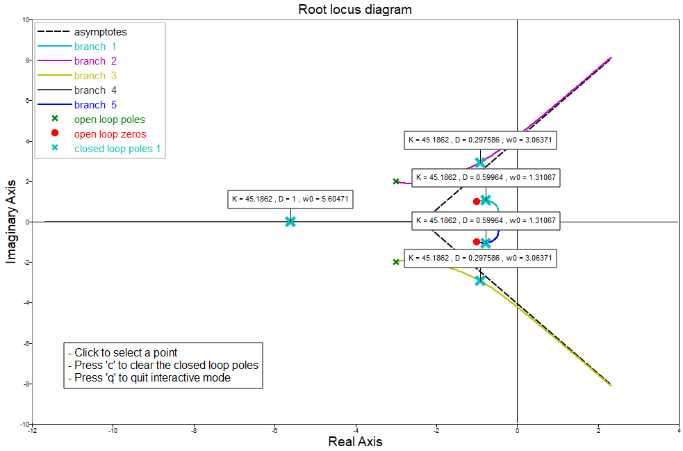 You may click again on the plot to select another point, press 'c' to remove the closed loop poles from the plot or press 'q' to quit the interactive mode. The outputs of interactive rlocfind are the gain and poles of the last selected point