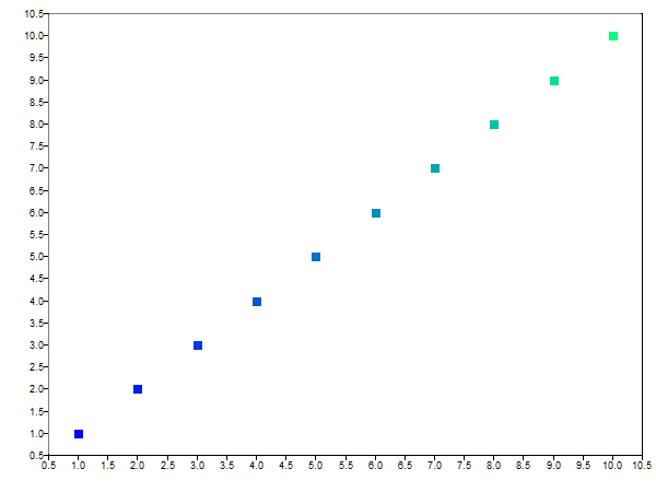 s1 = scatter(1:10,1:10,1:10, jet(10));