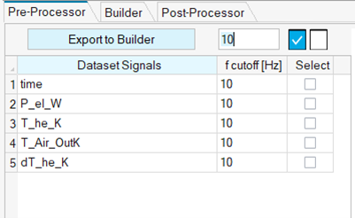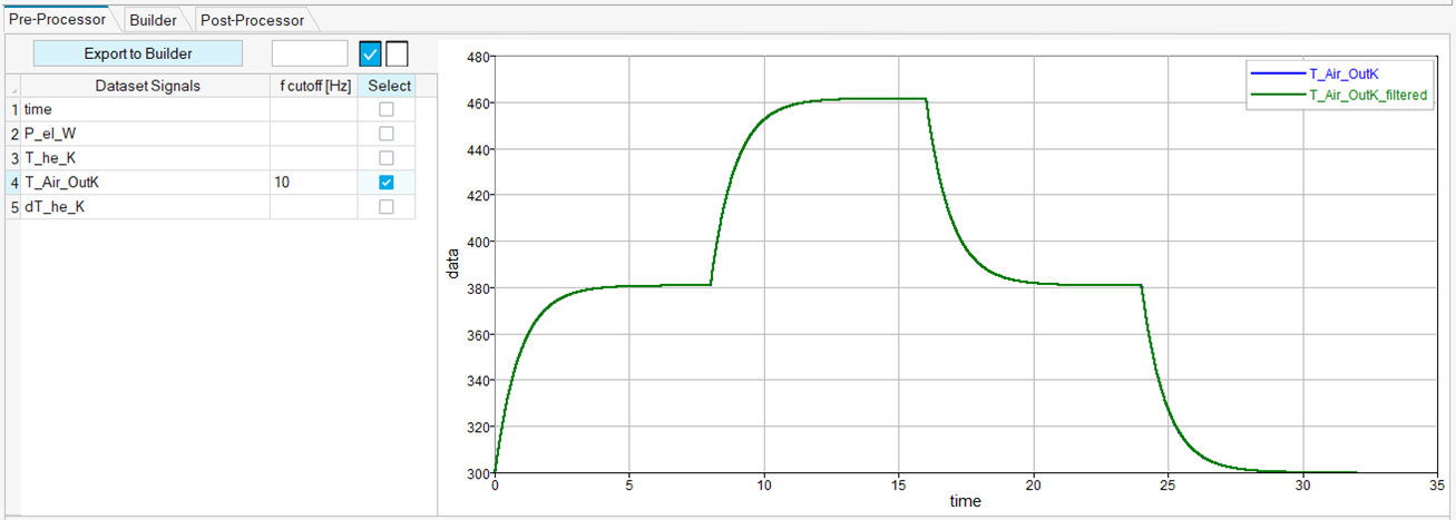 To filter a signal, enter the filter frequency in the f cutoff [Hz] column of that signal. The plot is refreshed automatically and shows the filtered and the baseline data.