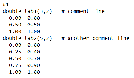 A table is declared by its datatype (e. g. double), followed by the table name (e. g. tab1) and its dimensions in brackets (e. g. (5,2)). As can be seen, multiple tables can be defined in the same text file. The table declaration is followed by the actual data. The first column of the table represents the input of the 1D table, whereas the second column lists the corresponding output values. The input values of the table must be in increasing order. The component interpolates linearly between the listed input values. More information regarding the format of tables can be found at CombiTable1Ds.