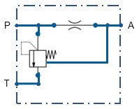 The 3-way flow control valve SR3 opens a discharge to the tank as soon as the set volume flow to the consumer is reached. The set volume flow is largely independent of pressure fluctuations of the consumer or the supply pressure.