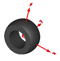 Model VoluminousWheel provides a simple visualization of a tire usinga torus and a pipe shape object. The center of the wheel is located atconnector frame_a (visualized by the red coordinate system in the figure below).
