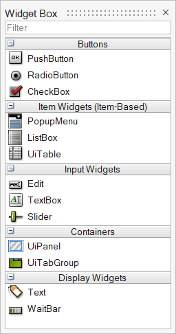 ウィジェットボックスには、インターフェースデザインで使用できるオブジェクトが含まれています。各オブジェクトには、プロパティエディターで変更できるプロパティが含まれています。