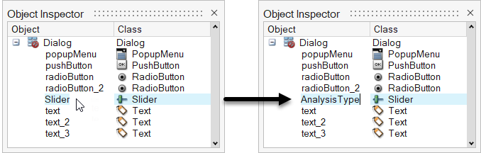 この例では、Slider オブジェクトの名前をSliderからAnalysisTypeに変更しています。