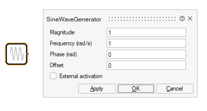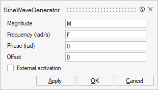 MagnitudeをM、FrequencyをFとして設定することにより、ブロックをパラメーター化できます。ここでMとFの両方は、モデルコンテキストで定義できるモデルパラメーターです。
