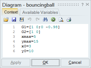 ダイアグラムのダイアログには、2つのタブ、コンテキストと使用可能な変数が表示されています。デフォルトでは、このダイアログは、ダイアグラムの変数を定義するためのOMLテキストエディタを含むコンテキストタブで開かれます。 -
