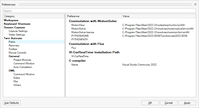 プリファレンス パス MotionView <HyperWorks_install_path>/hwdesktop/hw/bin/platform MotionSolve <HyperWorks_install_path>/hwsolvers/motionsolve/bin/platform MotionSolve License (Radflex) <HyperWorks_install_path>/hwsolvers/common/bin/platform Python (HyperWorks 2021の場合)。<HyperWorks_install_path>/common/python/python3.5/platform
