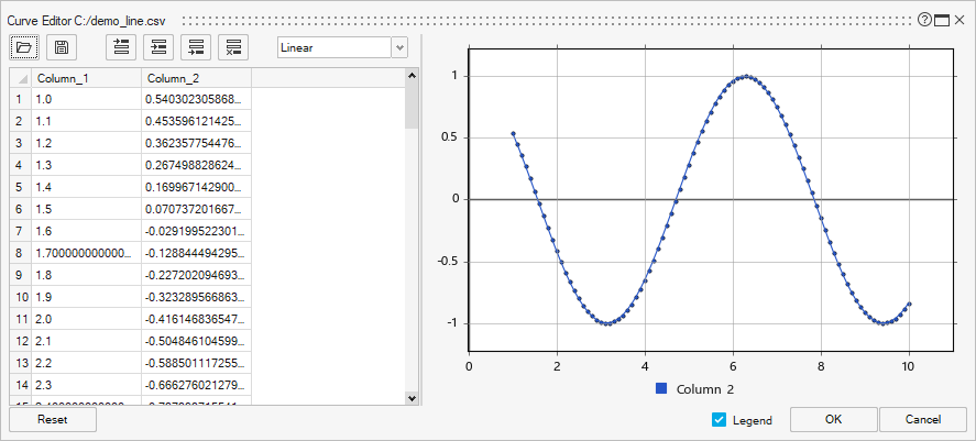 選択したデータポイントを削除します。 補間法のドロップダウンリスト アイコンの右側にあるドロップダウンリストから補間方法を選択します。 Legend プロットの凡例を表示する場合は、チェックボックスを選択します。 Reset カーブの初期値に戻すには、リセットボタンを選択します。