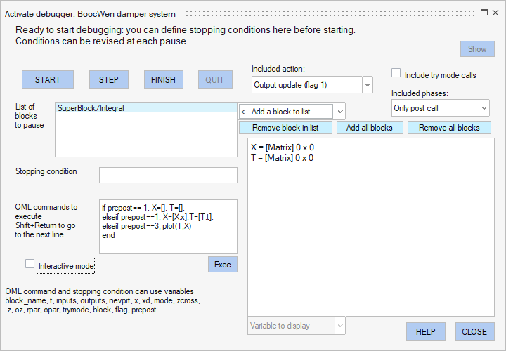 デフォルトでは、Twin Activateデバッガーダイアログボックスで Interactive modeチェックボックスが選択されています。インタラクティブモードでは、各一時停止中にOMLコマンドを手動で実行する必要があります。イInteractive modeのチェックボックスお非選択にすると、一時停止中にOMLコマンドのテキストボックスの内容が自動的に実行され,CONTINUEボタンがクリックされたかのようにシミュレーションが続行されます.