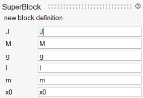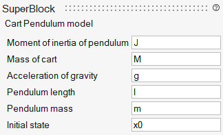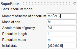 公開するパラメータは、必ずしもスーパーブロックのマスキングで得られるパラメータと同じとは限りません。例えば、台車 - 振り子システムにおいて、より自然なパラメータセットは、m、M、lと初期位置を公開することです。慣性モーメントは振り子の質量と長さ(J=ml2/12)、 g=9.81の関数です。また、完全な初期状態は必要ない場合が多く、システムの初期位置(カートの位置と振り子の角度)、 z0= x0(1) とθ0 =x0 (3) だけが考慮されます。これを公開パラメータとして使用するには、元のシステムのマスクパラメータ値を以下のように変更します。