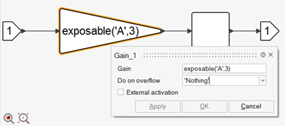 - Exposable関数を明示的に使用する場合、パラメータをExposableとして定義する方法があります。これは、スーパーブロックの任意の場所で、パラメータをExposableに定義する簡単な方法です。例えば、以下のスーパーブロックでは、GainブロックのGainパラメータは、Aという名前のExposableパラメータとして定義されており、デフォルト値は3です。