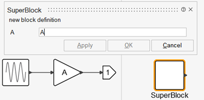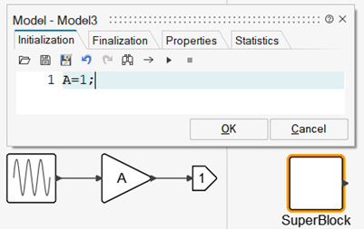 モデル初期化スクリプトで変数Aが定義され、スーパーブロック内部で使用されている(Gainブロックのパラメータ値を定義する)次のモデルを考えます。スーパーブロックがマスクされていない場合、パラメータは公開されず、スーパーブロックの生成コードにはA=1の数値が使用されます。Gainブロックのパラメータの値を1に設定した場合と同じになります。