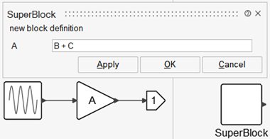一方、以下の例では、Aのパラメータ値が他の変数(特にBおよびC)の関数として定義されています。 この場合、公開パラメータは、BとCです(モデルが正しく動作するためには、これらの変数はスーパーブロックの外で定義されている必要があります)。また、Bは、スーパーブロックのコードを生成して得られた新しいブロックのパラメータとなります。