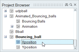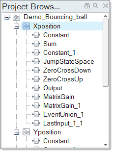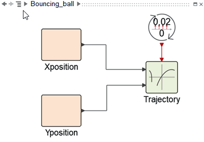 モデルの階層は、モデリングウィンドウに表示されるダイアグラムから、プロジェクトブラウザから、またはナビゲーションバーからの3つの方法で移動できます。次の例では、bouncing ballモデルのメインダイアグラムと、その内部に移動するオプションが示されています。