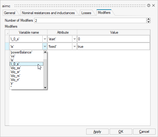 Modelica コンポーネントをダブルクリックすると、パラメータダイアログボックスに、一般タブの初期化セクションに関連する変数だけが表示されます。その他の内部変数は、Modifiersタブで設定できます。