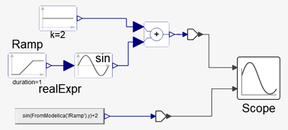 FromModelicaを使用すると、Twin Activateは異なる他のModelica構文が使用できます。Modelicaでは、コンポーネントのパラメータが他のコンポーネントのパラメータに依存するだけでなく、その出力が他のブロックパラメータ、さらには出力や入力に依存することがあります。これは、以下の例で見ることができます。Modelica RealExpressionブロックの式は、他のブロック(この場合はRamp )の出力に依存します。FromModelica関数は、Rampブロックのパラメータではなく、その出力を取得するために使用されます。