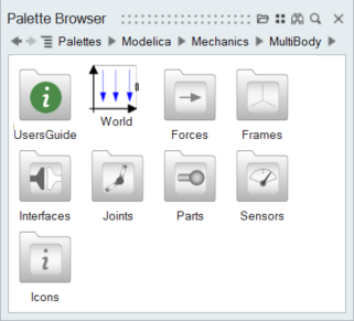 - Modelica標準ライブラリには、マルチボディブロックの専用パレットが含まれています。