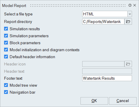 シミュレーションが実行されて、指定した内容に従ってレポートが生成されます。Watertankモデルのレポートの先頭ページは次のようになります。