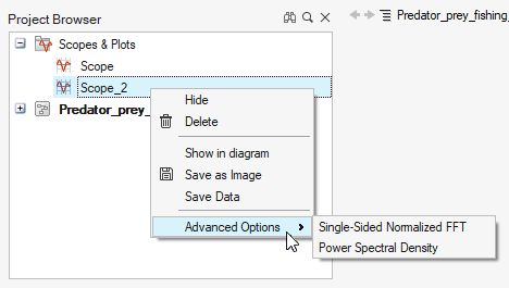 オプション 説明 Shows/Hide 作成されたプロットの表示と非表示を設定します。 Delete スコープブロックではなく、プロットウィンドウを削除します。 Show in Diagram 選択したブロックをダイアグラム内でハイライト表示します。