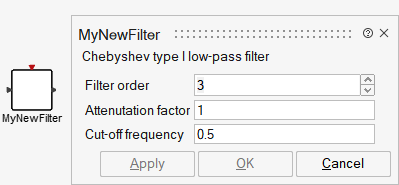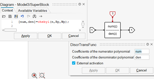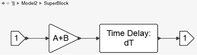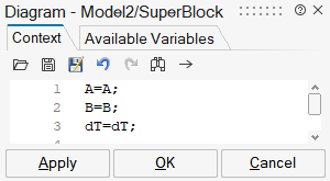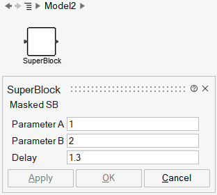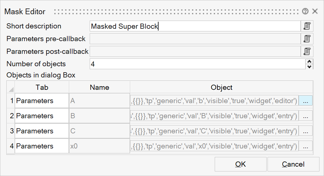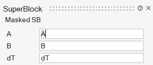 このマスクは、スーパーブロック内のA、 B 、 dT という名前のパラメータを、スーパーブロック外の同じ名前のモデルパラメータから定義します。このマスクは編集することができ、特にパラメーターの説明を入力することができます(オートマスキングでは、デフォルトでパラメーターの名前が説明フィールドに入ります)。