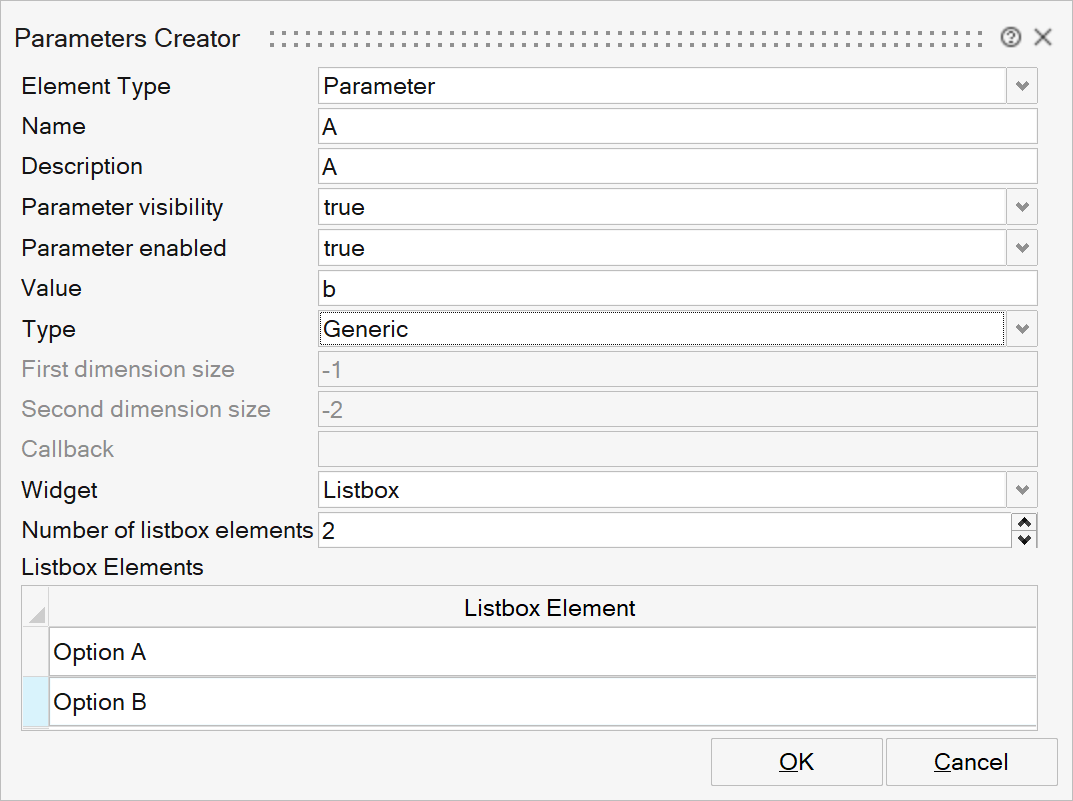 注: There are many options in the Parameters Creator, and not all fields are enabled