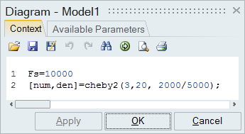 ダイアグラムのコンテキストでCheby2OML関数を適用します。Cheby2関数によって、ローパスフィルターの伝達関数の係数が生成されます。