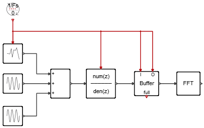 Bufferブロックの二つのアクティベーション入力ポートは、10,000HzでSampleClockブロックによってトリガー(駆動)されます。このトリガーにより、10,000Hzで実行するようにブロック(FFTブロックとVectorScopeブロックを含む)にダウンストリームが強制されるため、不要な計算とスコープ生成が発生する可能性があります。ReSampleClockブロックの追加により、Bufferブロックは必要な場合にのみ出力を更新するようになります。