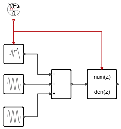 雑音が付加された正弦波が、離散伝達関数によるデジタルローパスフィルターを通過するようにブロックを接続します: