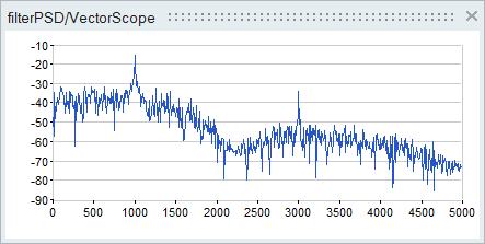 次のようなパワースペクトル密度のグラフが表示されます。周波数1000Hzと3000Hzに2つのピークが見られます。チェビシェフローパスフィルターによって元の信号が減衰するため、3000Hzのピークの方が低くなります。