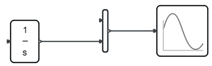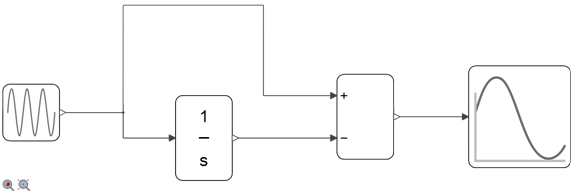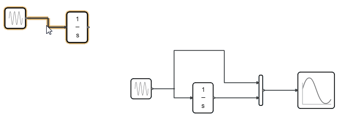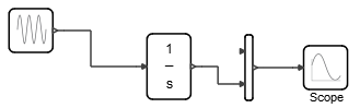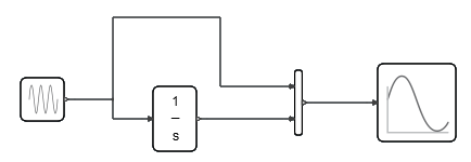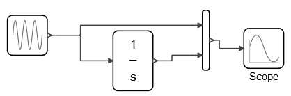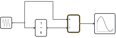 ダイアグラムにある残りのブロックを次の図のように接続します。最初の2つのブロック間のリンクが曲線になっていることがわかります。このリンクが直線になっている場合は、SineWaveGeneratorブロックを選択してIntegralブロックより上になるように移動し、リンクが曲線になるようにします。