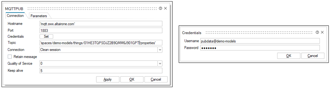 ブロックConnectionタブで、Hostname、Credentials、およびTopicエンドポイントを、Space名、Thing ID、およびこの場合はプロパティ(必須ではありません)で、構造に従って設定します: