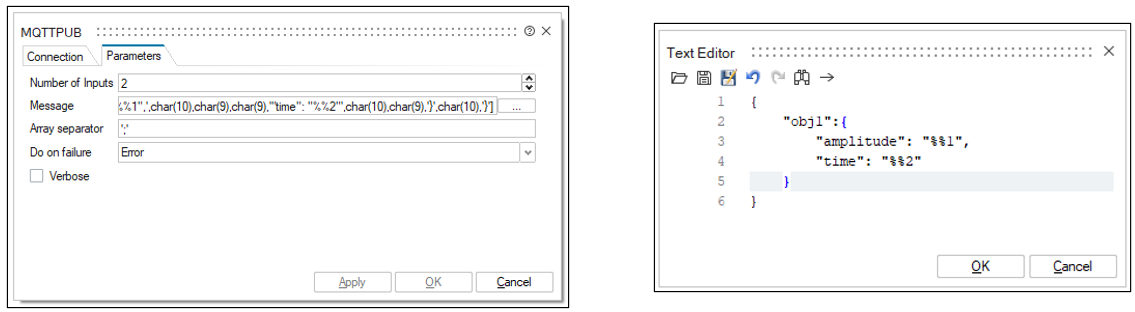 ブロックパラメータータブに、 入力数(この場合、振幅と時間の2つ出力数)と Messageがあることを確認してください。IoT Studioにデータを送信するには、JavaScript Object Notation(JSON)形式を使用する必要があります: