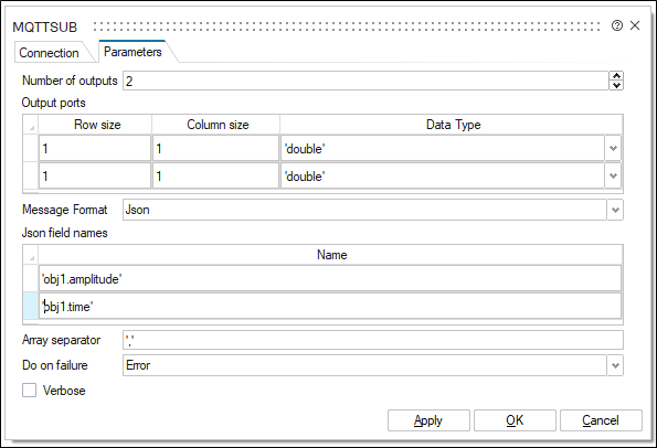 ブロックパラメータータブに、 出力数(この場合、振幅と時間の2つ出力数)と Messageがあることを確認してください。IoT Studioから受信するため、JSON形式を選択し、1つのオブジェクトからメッセージを受信するため、各属性を受信するために以下のフォーマットに準拠する必要があります。