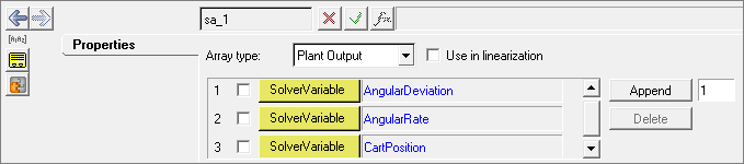 PlantOutputソルバー配列は、AngularDeviation、AngularRate、CartPositionというソルバー変数を含みます。Plant Outputプロパティは次のように設定します: