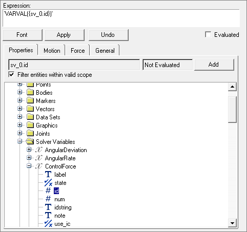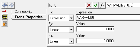ControlForceのTrans Propertiesタブで、次の図のようにFxにExpressionを選択し、fに`VARVAL({sv_0.id})`を入力します。この式は、ControlForceを1つ目のソルバー変数sv_0に指定します。この変数は、Twin Activateから送信された制御信号をCartの並進ジョイントに作用する制御荷重として設定します。